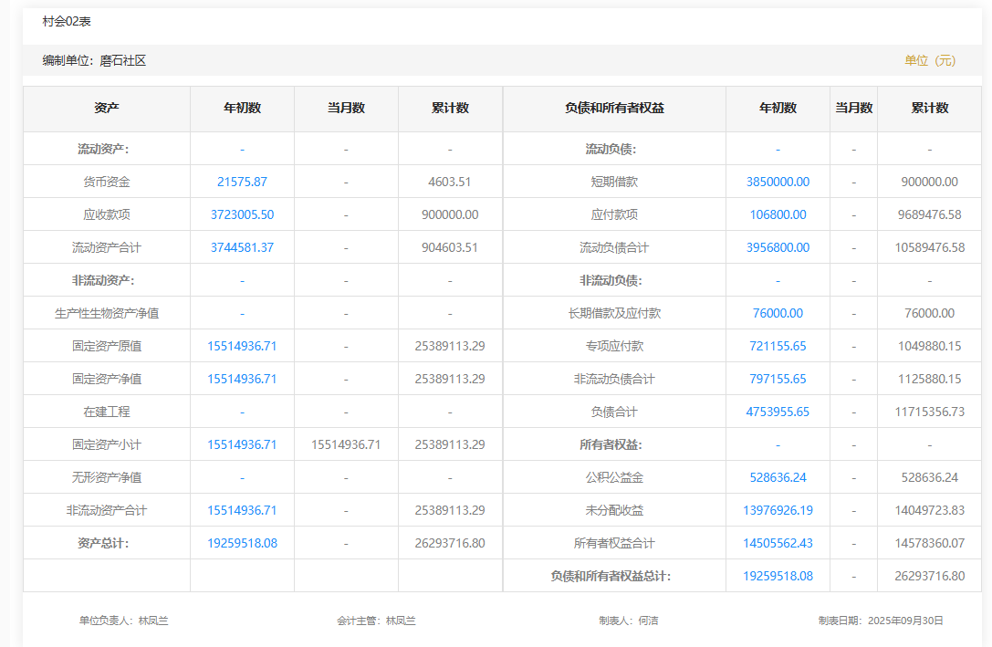 2025年8月磨石社区村级财务资产负债明细