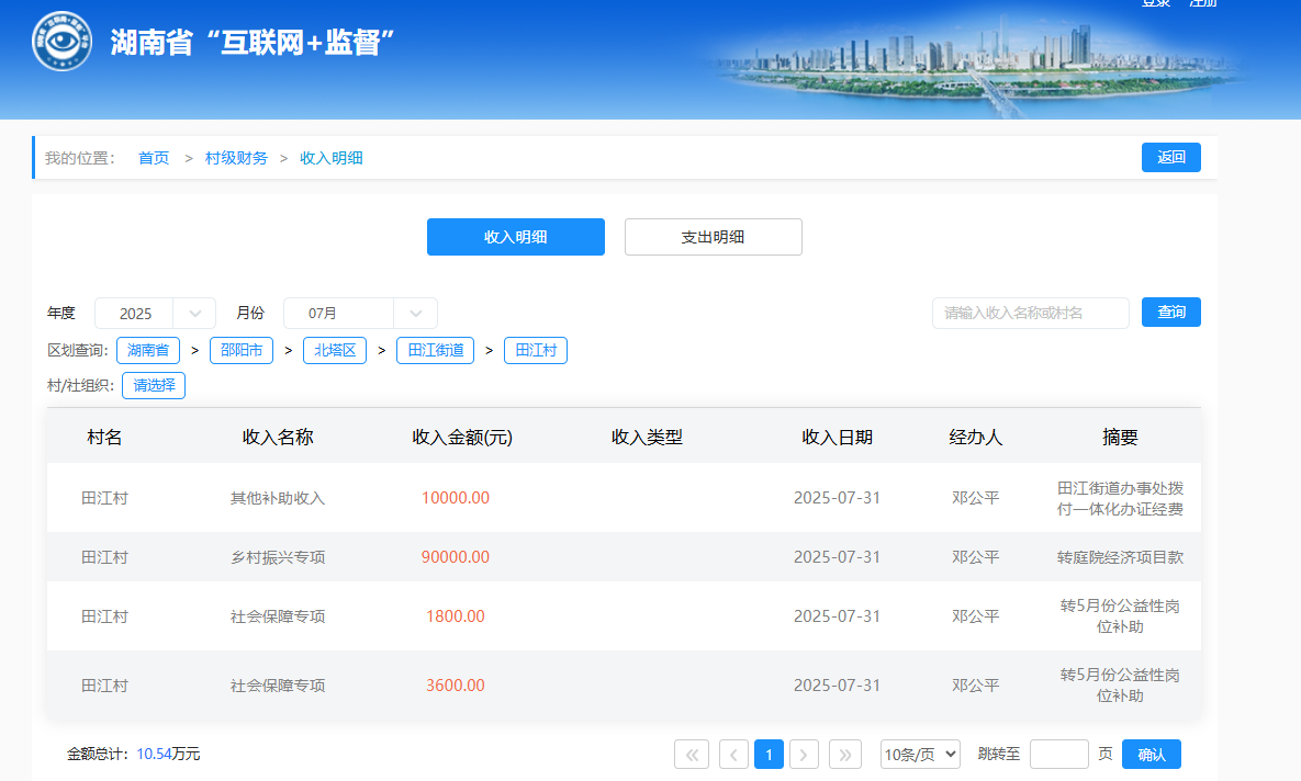 2025年7月田江村村级财务收入明细