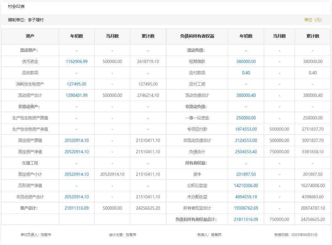 2025年8月李子塘村村级财务资产负债明细