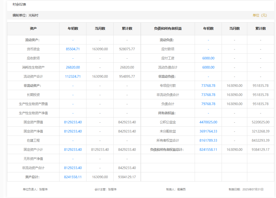 2025年7月光裕村村级财务资产负债明细
