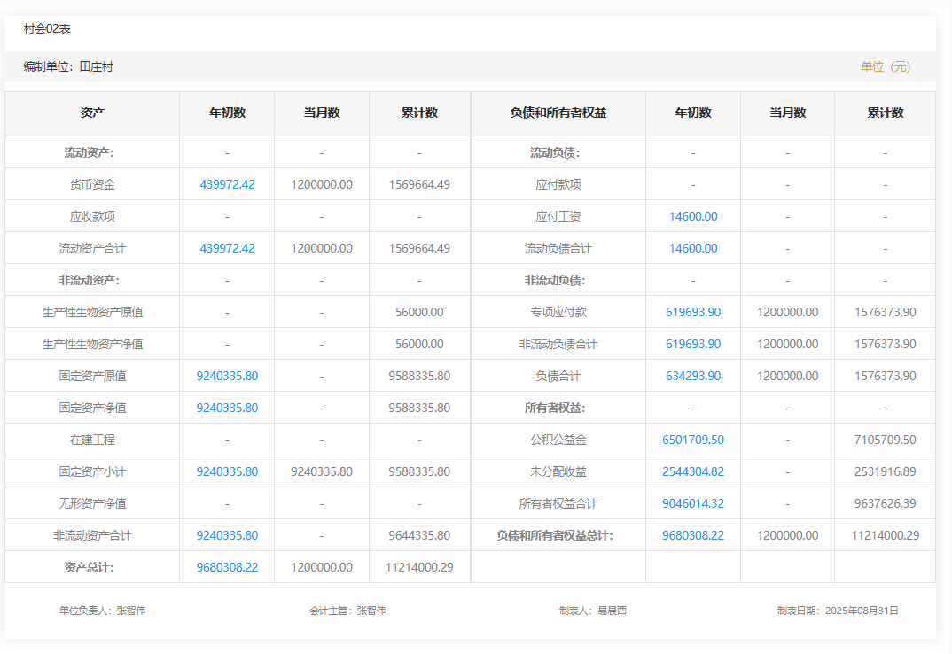 2025年8月田庄村村级财务资产负债明细