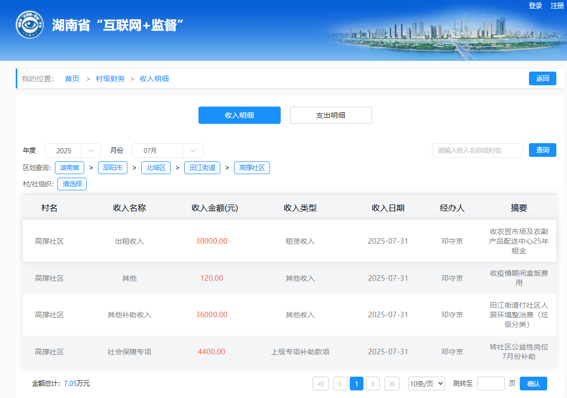 2025年7月高撑社区村级财务收入明细