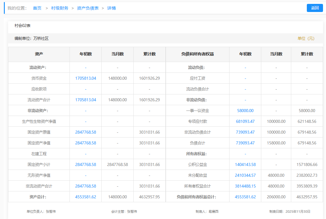 2025年11月万桥社区村级财务资产负债明细