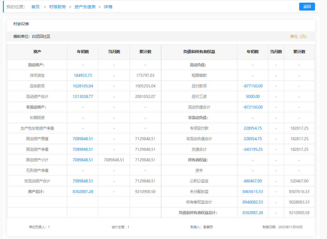 2025年11月白泥田社区村级财务资产负债明细