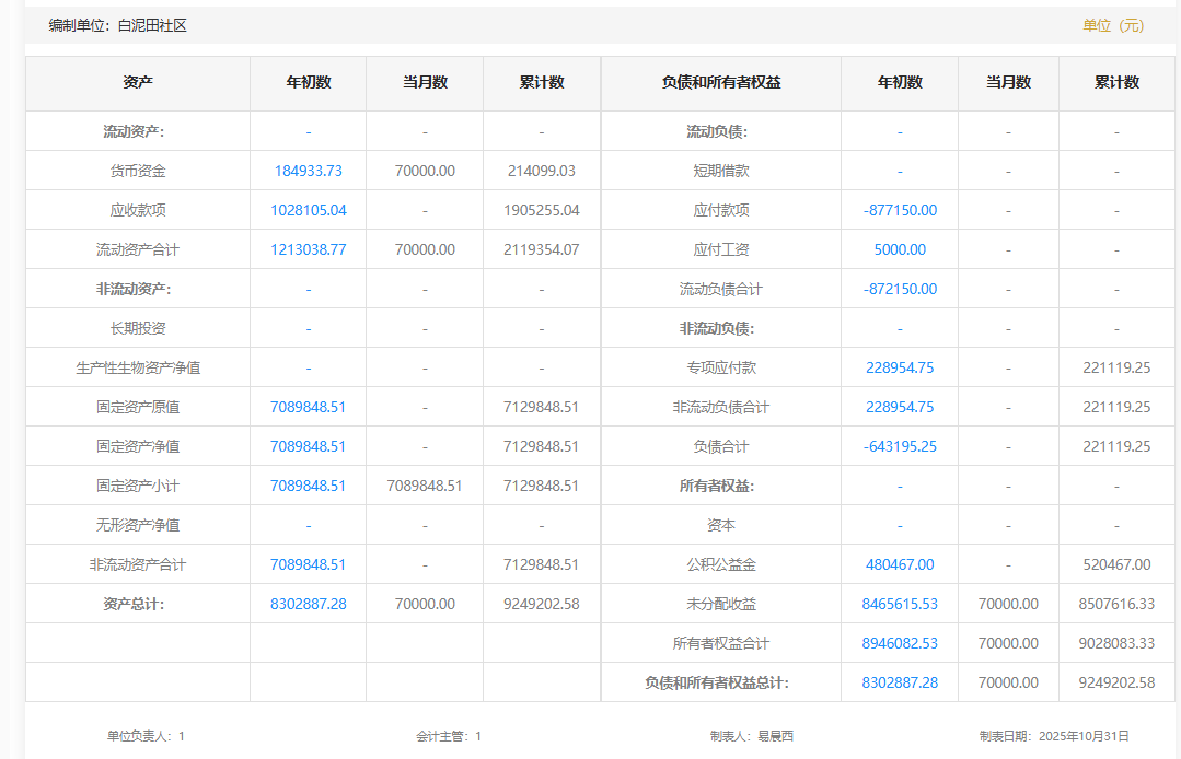 2025年10月白泥田社区村级财务资产负债明细