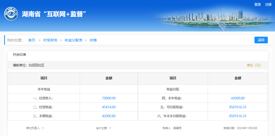 2025年11月白泥田社区村级财务收益分配明细